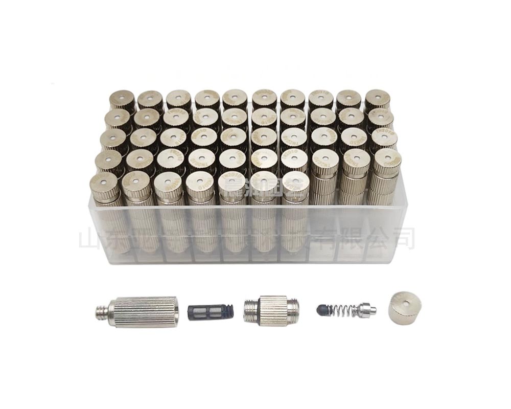 高壓霧化噴嘴采用黃銅主體,內鑲不銹鋼噴嘴芯和不銹鋼導流葉片,內含防滴漏裝置,液體在10Kg-70kg的水壓之下,高速流動(dòng),在導流葉片中形成一個(gè)離心旋渦,從高壓霧化噴嘴噴孔中噴出極細微的空心式霧粒。高壓霧化噴嘴使用特氛龍灘網(wǎng),霧粒粒徑僅為3-5微米,此種高壓霧化噴嘴噴孔是使用美國打孔機打孔,孔徑在0.1mm—0.5mm 之間,高壓霧化噴嘴的自由組合,可以有效的調節加濕量和噴霧效果。該高壓霧化噴嘴的特點(diǎn)是不易堵塞,耐磨性好,噴霧均勻,可以有效的提高產(chǎn)品的質(zhì)量和生產(chǎn) 效率,制作精良,使用成本低廉。